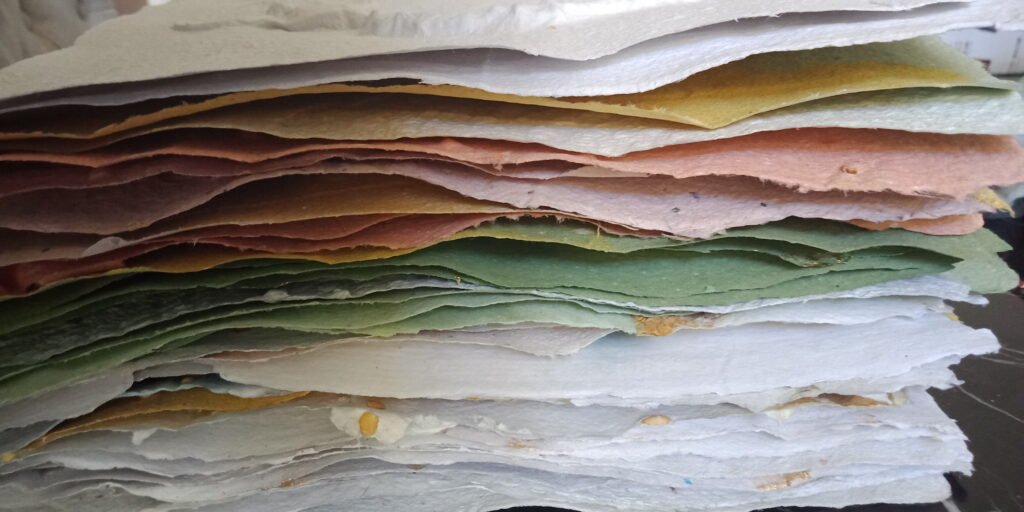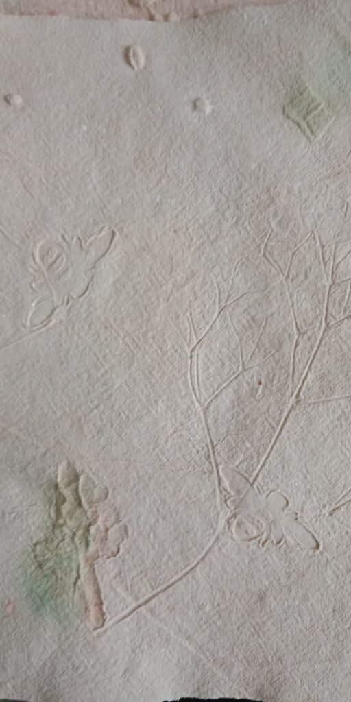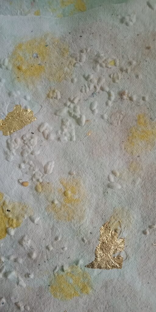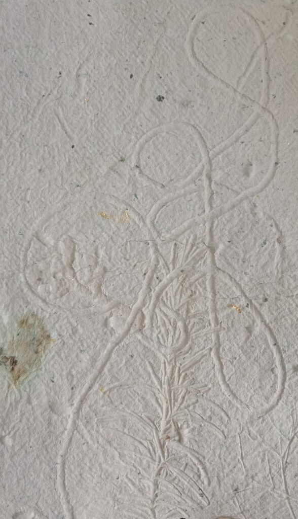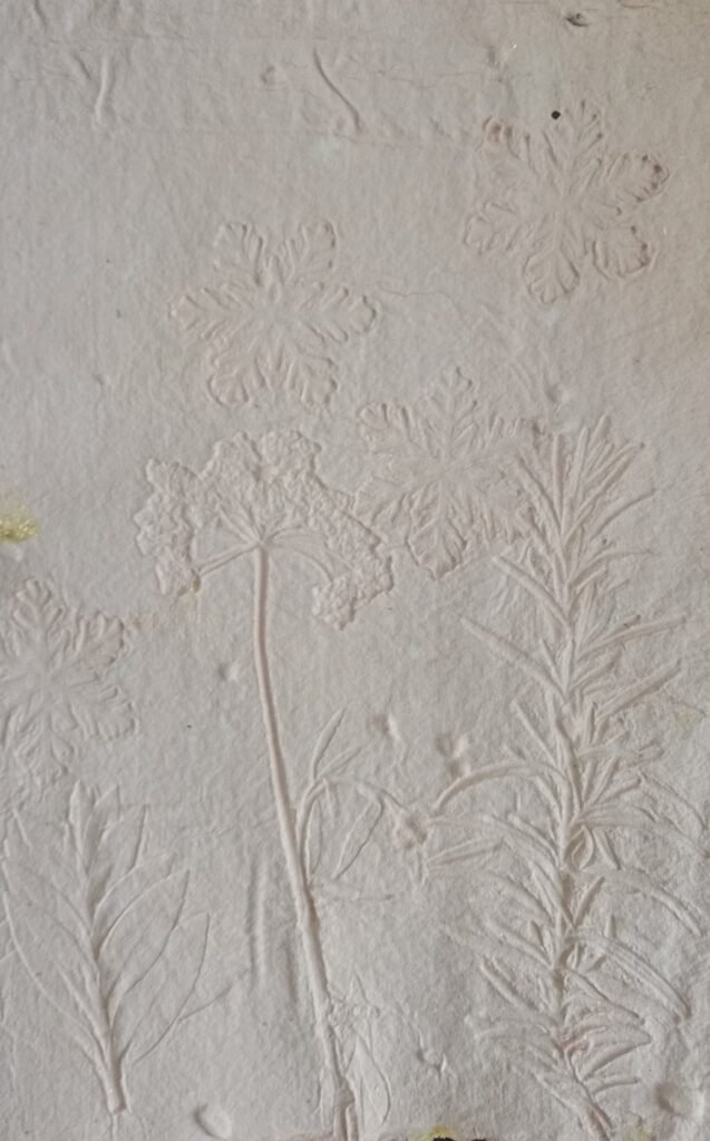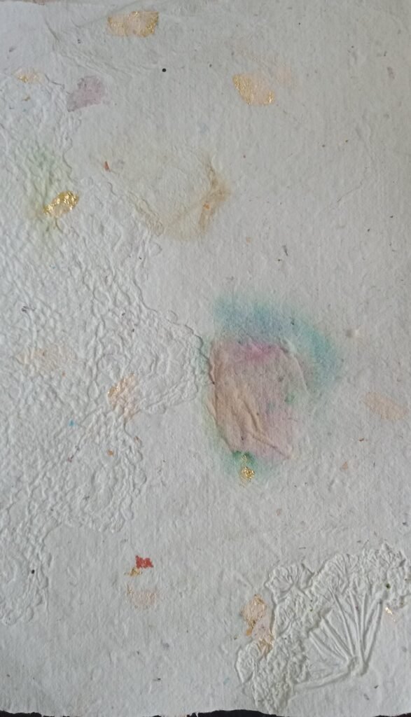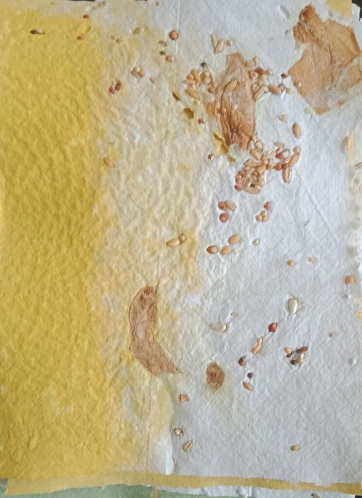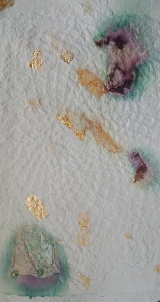 Repurposed handmade paper naturally dyed with flowers and leaves, bark, leaf textures, and other natural objects. 14.8 x 21 cm.