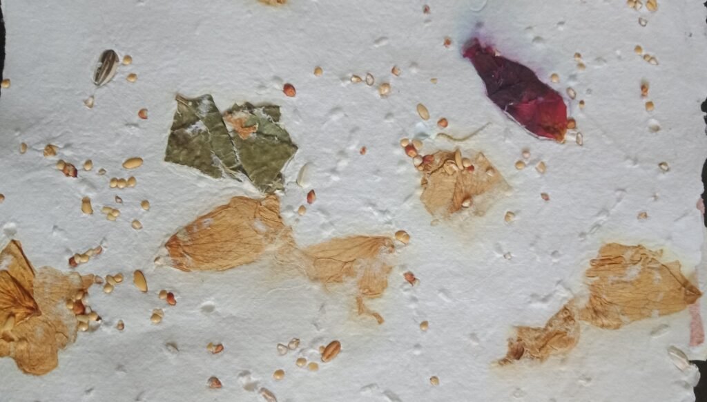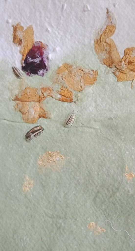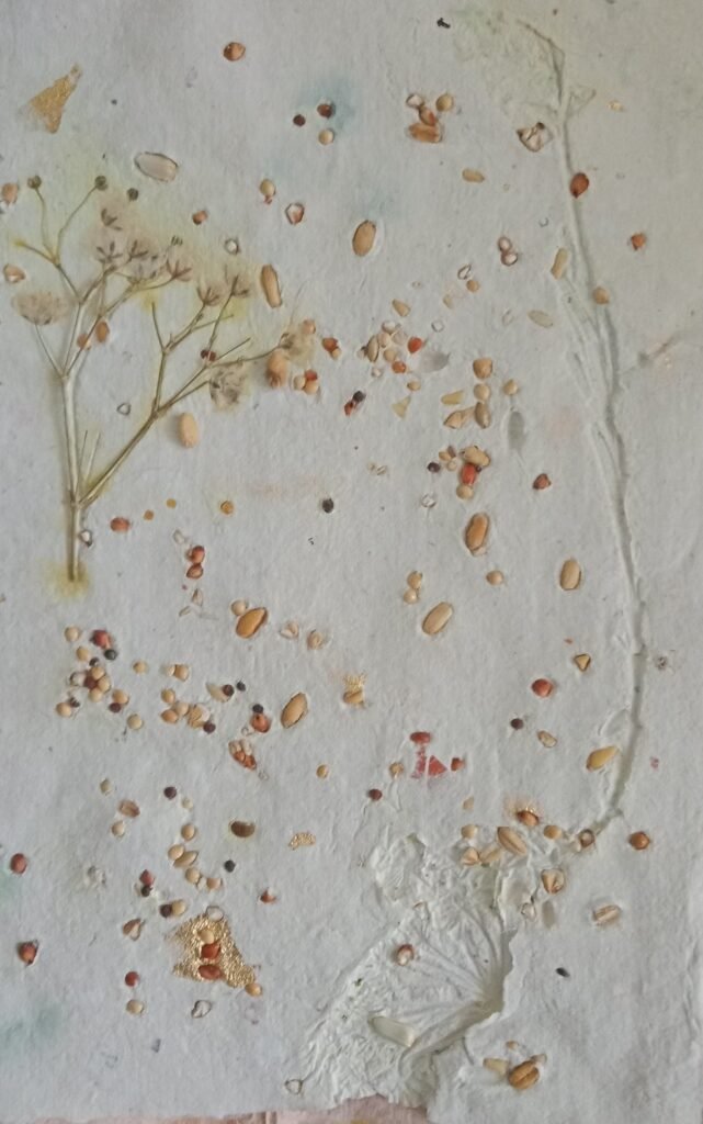 This artist book is made from repurposed, handmade paper naturally dyed by flowers and leaves, incorporating bark, leaf textures, and other natural objects. It traces the cycle from seed to decay, highlighting growth, transformation, and renewal across human and more-than-human systems.
