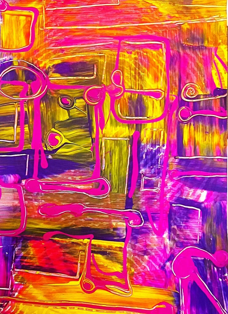 Himself celebrates the dance between artist and muse, the delicate interplay of presence and imagination, of what is seen and what remains unseen. It is an invitation to witness, to participate, and to be drawn into the dance of meaning, forever intertwined. Mixed media including gesso, oil paint, oil pastel, graphite and medium on canvas 90 x 122 cm.