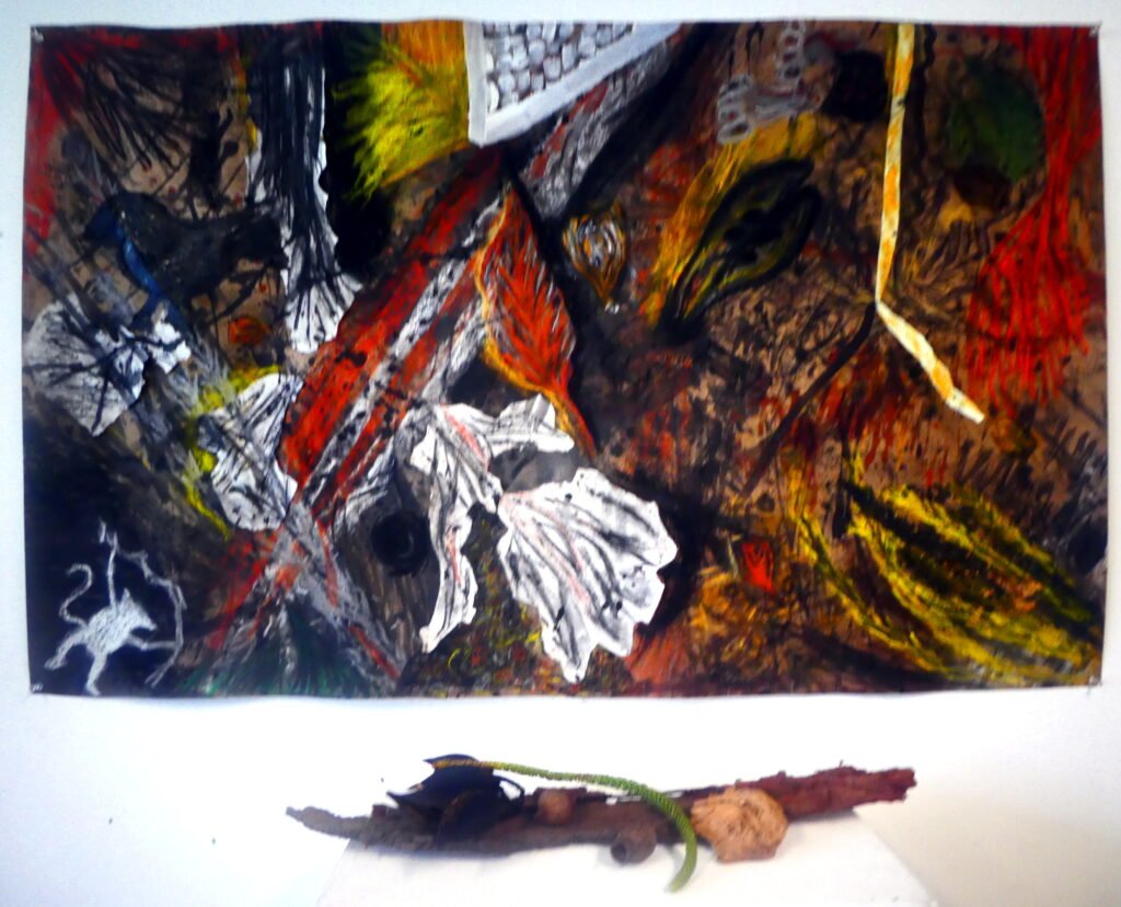 Mixed media charcaol, pastel, ink, soil, leaves, sticks, water, paper and natural elements and on cardstock. 85 x 120cm.