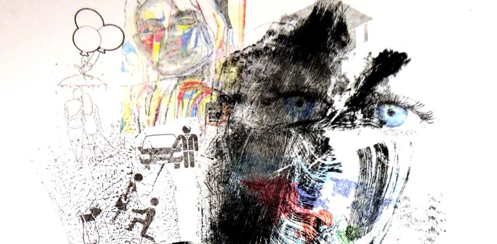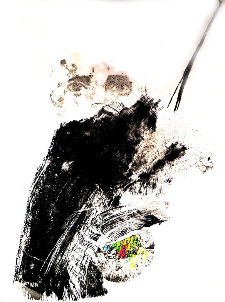 Monotype on acetate and screen print, print press, watercolour, ink water-based printing inks, water-based screen-printing ink and paper. Combined 60 x 90 cm.