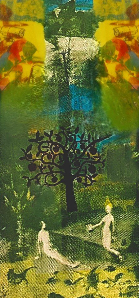 The first panel replaces Eve’s apple with a smartphone, a luminous fruit mediating desire and knowledge. Scrolling, tapping and consuming, it become gestures of control within networked systems and surveillance. Seduction is no longer by nature, but by technology, a fall not from Eden, but into distraction, commodification, and curated identity.