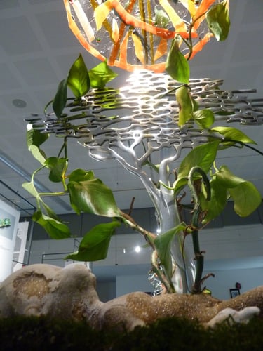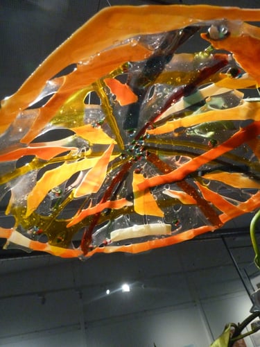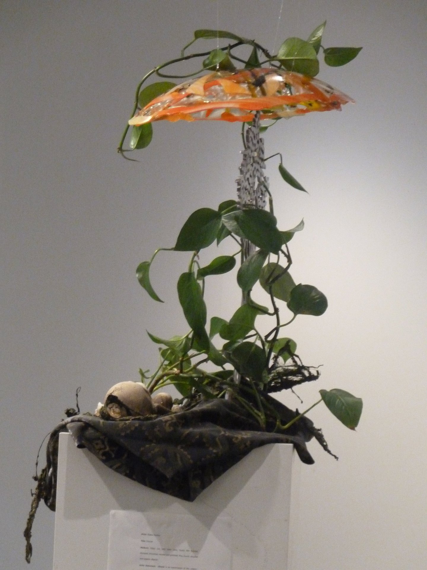 Glass: cut, cast, pate verre, fused, kiln formed, slumped, dremeled, sanded and polished. Plus, found, recycled and organic objects. Installation: 1000 × 2500 cm with glass baby 50 × 20 × 15 cm.