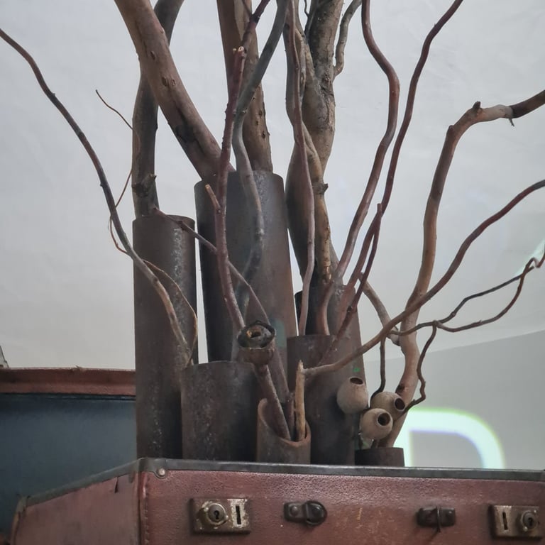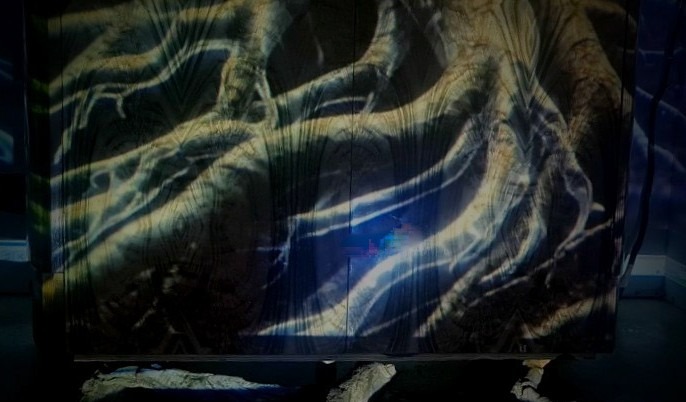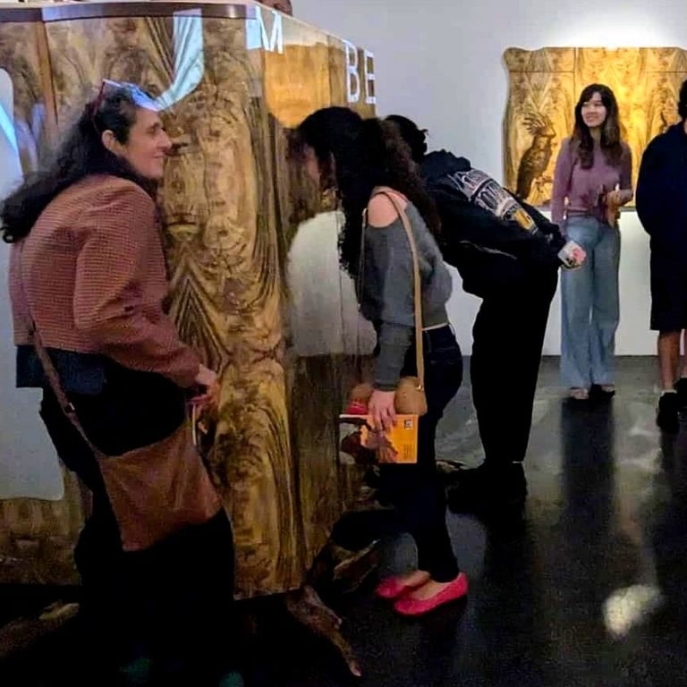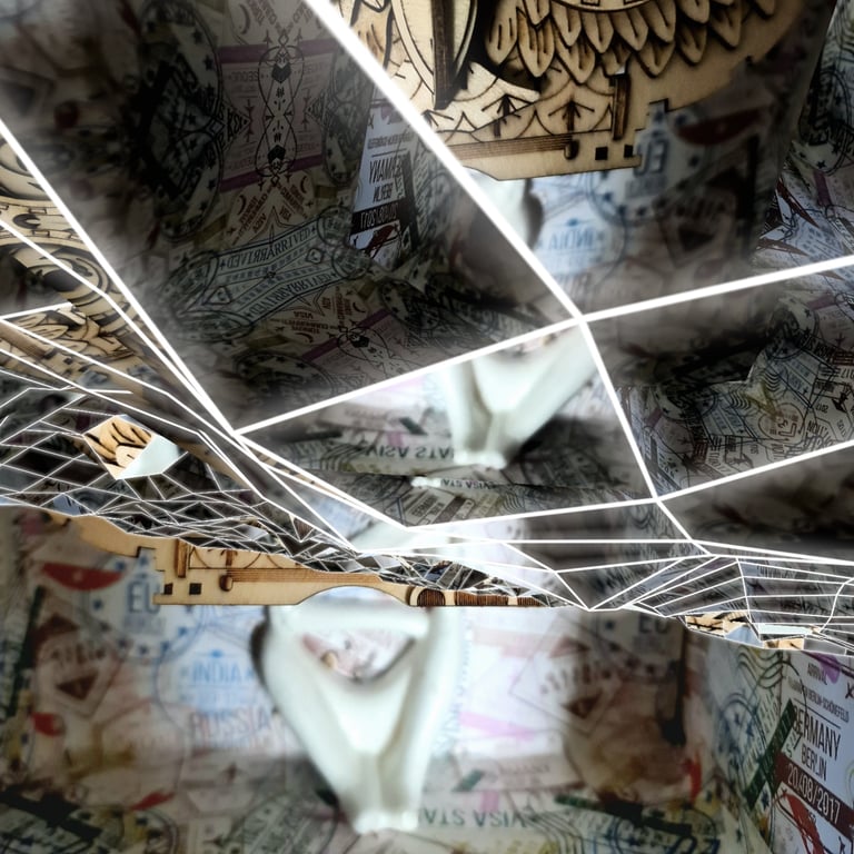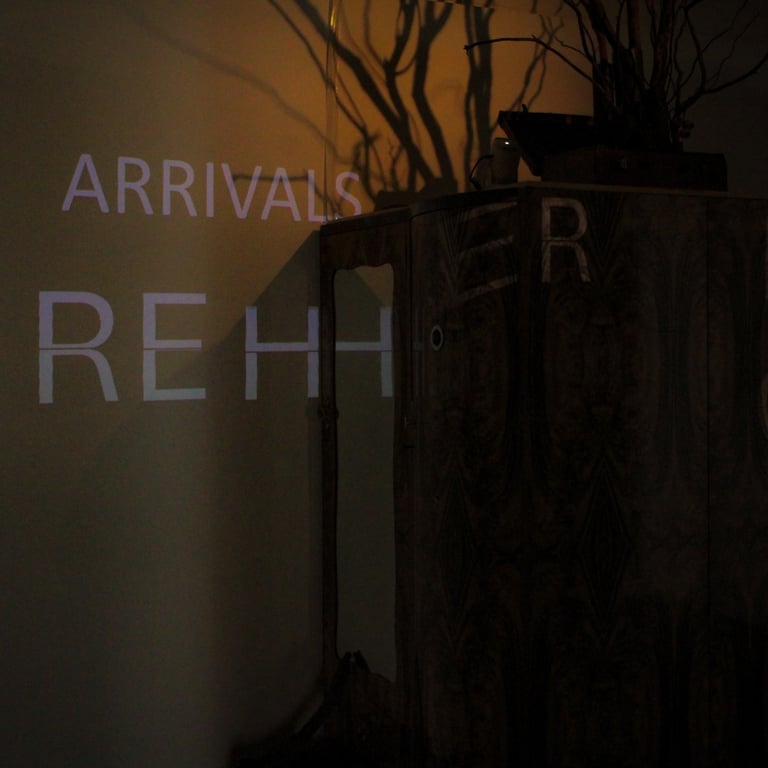 The Map of Becoming is an immersive, transnational, and interdisciplinary exploration of migration, memory, and belonging. Through installation, sculpture, painting, projection, and participatory elements, the work is a meditation on the interconnectedness of life, structured around layered metaphors. The cube, made from a local repurposed 1940s wardrobe, embodies containment, memory, and transformation. Tree roots anchor ancestry and cultural traces, while the tree canopy reflects growth, adaptation, and hybrid belonging. Arrivals & Departures boards mirror the constant flux of migration, using words and imagery to foreground the ethical, relational, and empathetic dimensions of migration.A triptych of cockatoo, faun, and owl evokes mobility, hybridity, and ancestral memory. Peepholes, performative elements, sound, and mirrored fragments create intimate, layered, and participatory perspectives. Together, these elements form a living ecosystem reflecting the fragile, shifting, and relational nature of identity, home, and belonging.