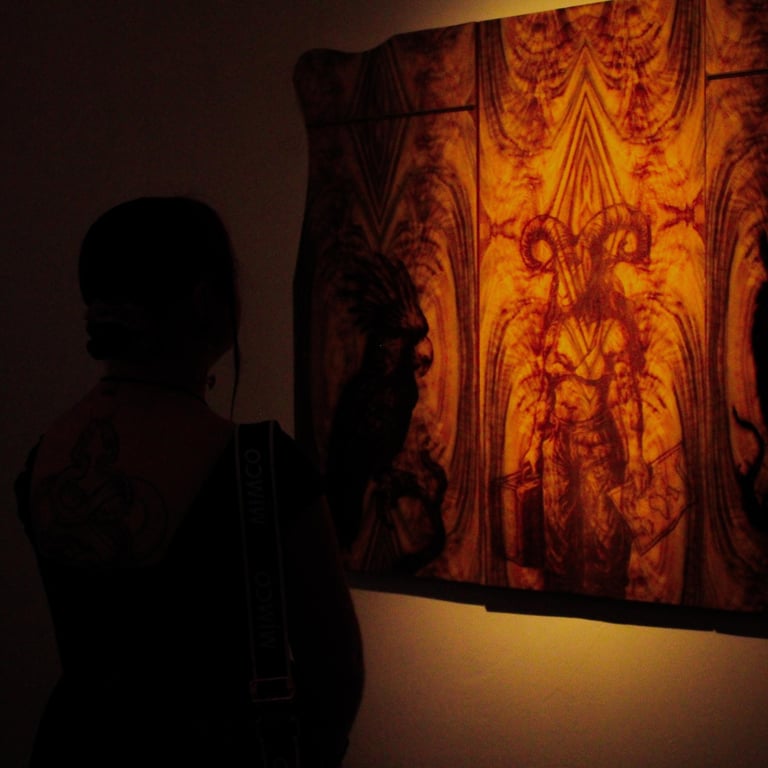 Peephole Peepholes, color, light, and paintings of mythic hybrid figures evoke transformation, memory, journey, and enduranceemory, journey, and endurance.